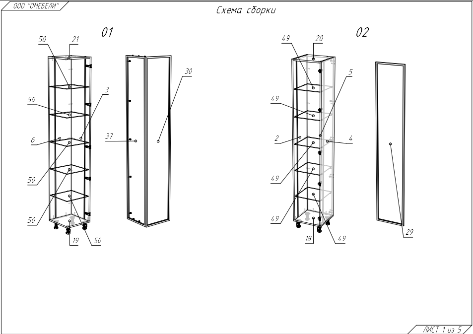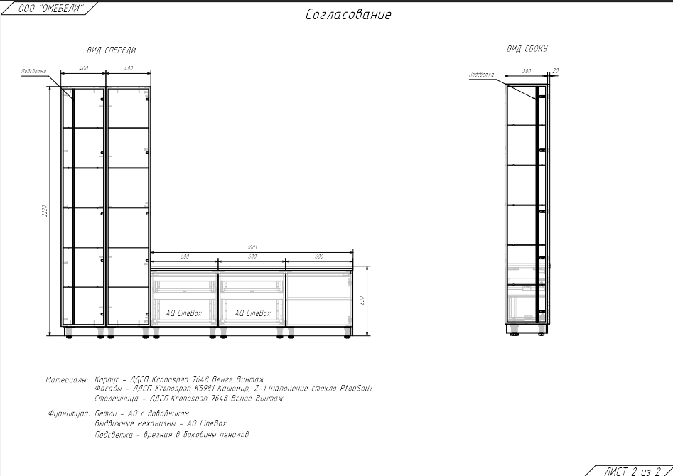 Проект корпусной мебели разрабатывается в программе «Базис-Мебельщик». Создаётся 3D-модель, которая передаётся в цех распила. Также формируются спецификации на материалы и фурнитуру с указанием артикулов, количества и поставщиков. Разрабатываются схемы сборки для каждого корпуса.